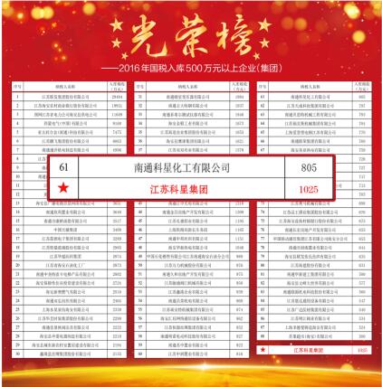 2016年,在縣委縣政府和南通市國稅局的正確領導下,江蘇科星集團暨南通科星化工有限公司實現集團公司稅收超千萬,堅持以環保、安全、消防、質量、節能、高效的經營理念,取得了驕人業績。