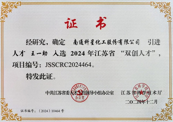 南通科星化工股份有限公司“植物基金屬加工液”項目領(lǐng)銜人王一助總工程師榮膺2024年江蘇省“雙創(chuàng)人才”稱號!