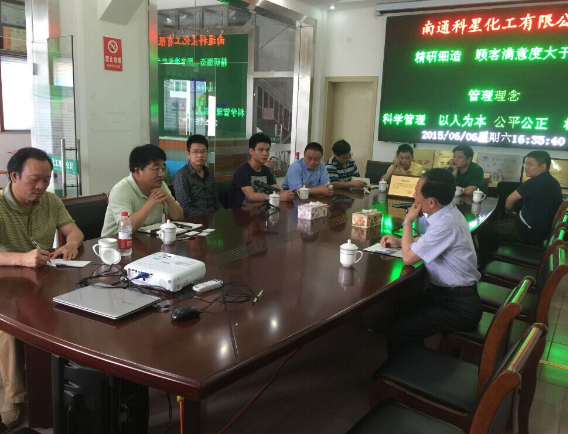 2015年6月6日,中國新型建材設計研究院黨委書記、副院長施存有先生(左一)、美國Meecotech納米技術首席技術官許之詠博士(左二)、中央“千人計劃”專家、南通科星化工有限公司技術總監姜興茂教授(左五)在科星公司會議室與董事長吳龍鐵先生就納米新材料及其它技術進行廣泛交流。