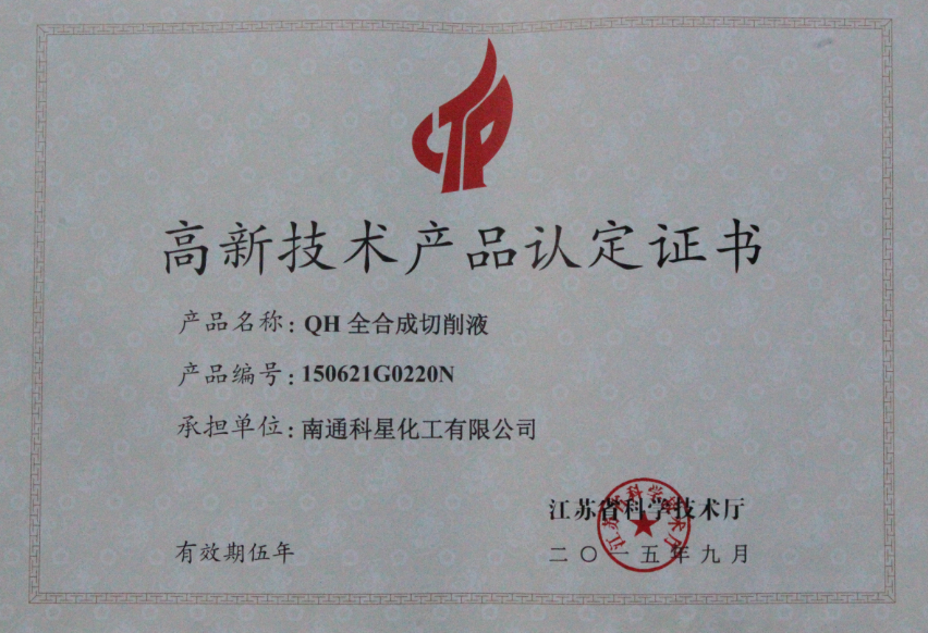 我公司QH全合成切削液榮獲省高新技術(shù)產(chǎn)品。該產(chǎn)品是一種新型環(huán)保高效切削液,與目前市場所用切削液產(chǎn)品相比較,具有更先進(jìn)的技術(shù)水平,完全達(dá)到油性乳化液產(chǎn)品性能。使用周期長,管理得當(dāng),長期使用無需更換槽液。有著優(yōu)良的潤滑極壓性、冷卻性,防銹性、沉降性、油水分離性和清洗性等性能,工作液清澈透明,適用范圍廣,適合各種金屬材料的生產(chǎn)加工工藝。
