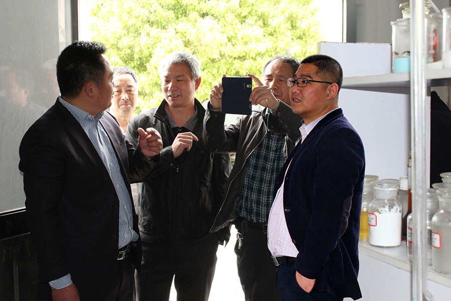 科星化工銷售總監吳昌祥(左一) 在理化室,與五洲新春集團領導著重介紹了在生產過程中如何對貨品取樣抽檢,以及對品質全程把控的工序流程。富日泰俞總(右二)裘廠長(左二)森春有限公司陳總(右一)李總(右三)