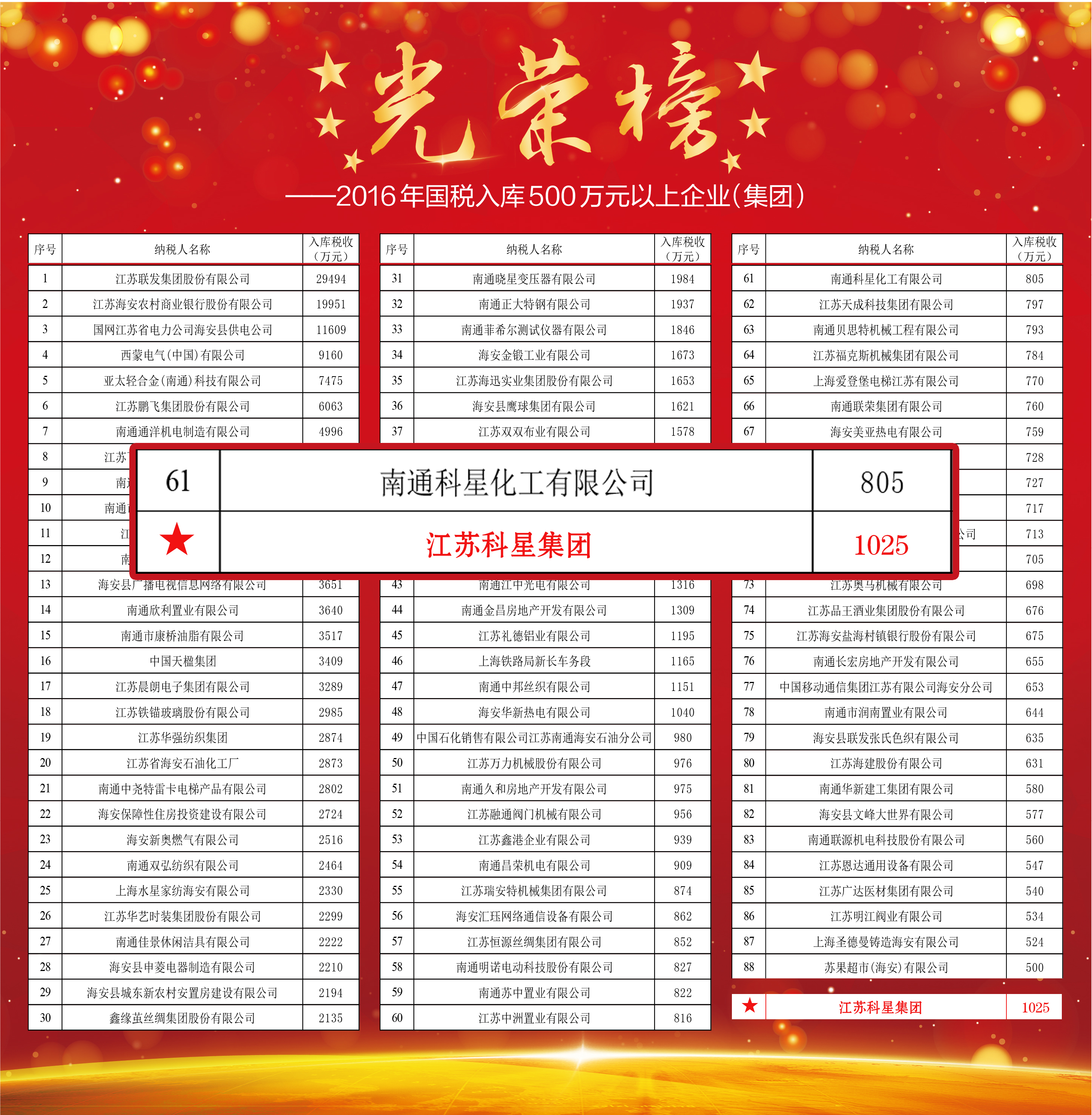 2016年,在縣委縣政府和南通市國稅局的正確領導下,江蘇科星集團暨南通科星化工有限公司實現集團公司稅收超千萬,堅持以環保、安全、消防、質量、節能、高效的經營理念,取得了驕人業績。