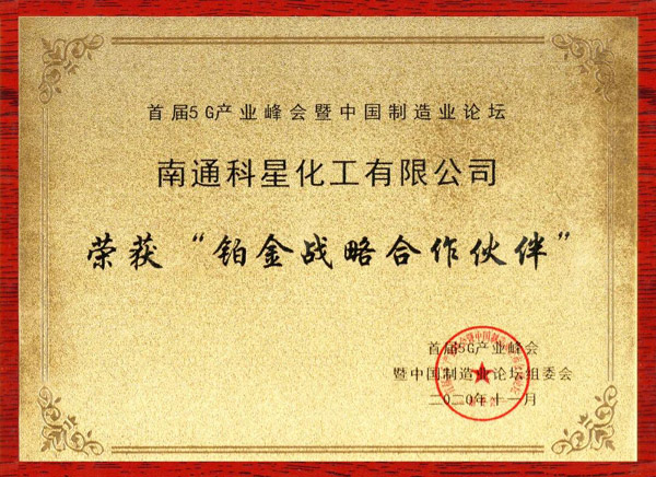 5G產(chǎn)業(yè)峰會(huì)暨中國(guó)制造業(yè)論壇組委會(huì)為南通科星化工有限公司授予“鉑金戰(zhàn)略合作伙伴”的榮譽(yù)。