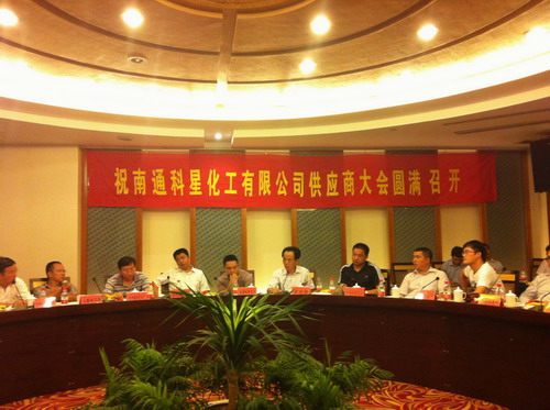 首先請(qǐng)代表們到公司參觀生產(chǎn)、研發(fā)、倉(cāng)儲(chǔ)、辦公現(xiàn)場(chǎng),在公司多功能會(huì)議室,代表們觀看了公司產(chǎn)、供、銷(xiāo)和公司發(fā)展史影像片,然后到主會(huì)場(chǎng)——海安王府賓館四樓召開(kāi)了全體供應(yīng)商會(huì)議,同時(shí)邀請(qǐng)了地方政府、金融系統(tǒng)領(lǐng)導(dǎo)一同參加。會(huì)上,吳總首先介紹了公司近年來(lái)發(fā)展情況,接著就原料的質(zhì)量等問(wèn)題提出了我公司的要求。最后由上海甲基、南京古田化工、泰州東興物資、南通仁和化工供應(yīng)商代表發(fā)言講話。